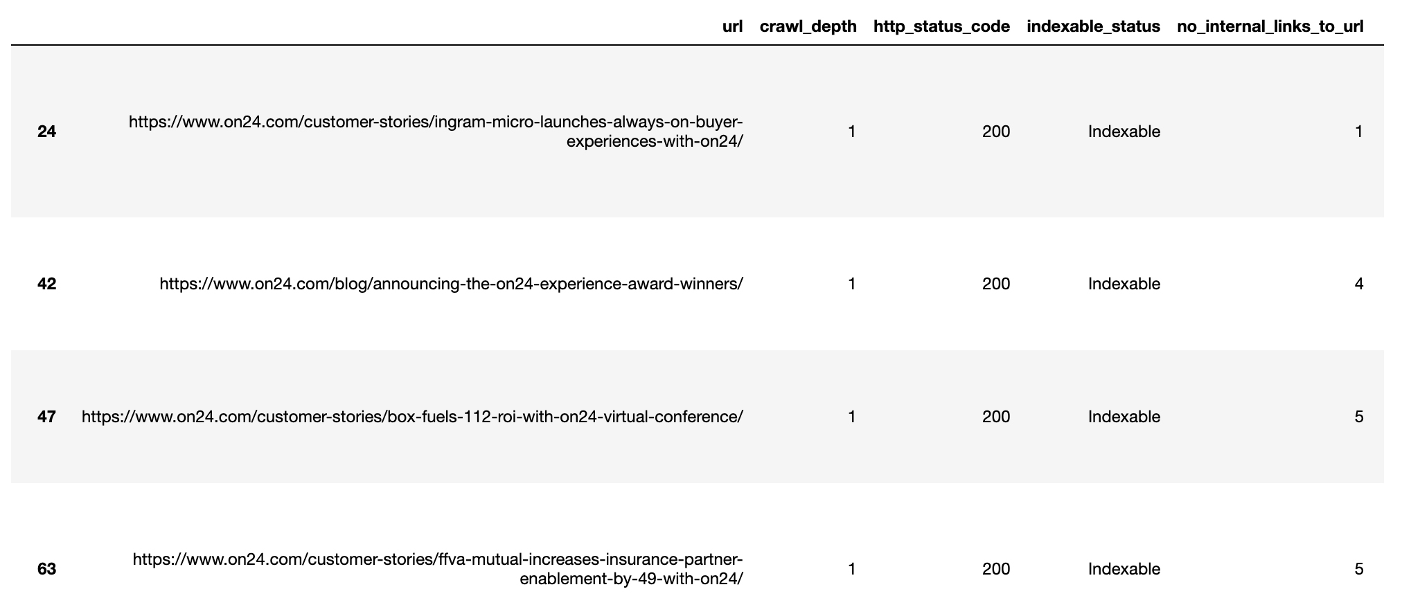 Now we have a data frame with each URL marked as under-linked under the ‘’sd_int_uidx’ column as a 1.